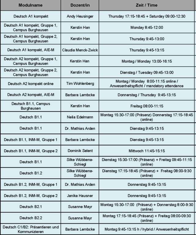 Changes in the course data are possible and will be noted here: Registration German Courses on the Learning Campus.