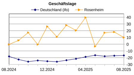 Die vergleichbaren Werte des ifo-Institutes entwickelten sich unterschiedlich, so konnte sich die Geschäftslage auf negativem Niveau mit -16,7 leicht verbessern, während die Geschäftserwartungen im zweiten Monat in Folge auf nunmehr -12,90 zurückgingen. Die Geschäftserwartungen sind somit in Rosenheim wesentlich pessimistischer.