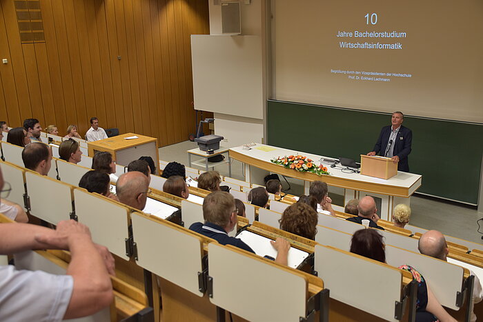 Foto 6: Prof. Dr. Heinrich Seidlmeier, Studiendekan der Fakultät für Betriebswirtschaft, erinnert an die ersten Absolvent*innen des Studiengangs Wirtschaftsinformatik an der TH Rosenheim