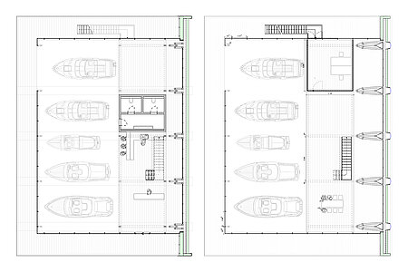 Angegliedert an den Showroom, in dem sich auch ein abtrennbarer gläserner Werkstattbereich für ein Boot befindet, ist eine zweigeschossige Einheit, bestehend aus einer den Showroom überblickenden Verkaufsebene und einem darunterliegenden Büro mit einem Mitarbeiterraum und einer Teeküche. Die zweite Ebene wird einerseits über eine Innentreppe sowie eine Stahl-Außentreppe erschlossen. Die Außentreppe dient als äußere Erschließung der neuen Einheit und gleichzeitig als zweiter Fluchtweg. Ausgestellt und gewartet werden die nachfolgend dargestellten Bootstypen.