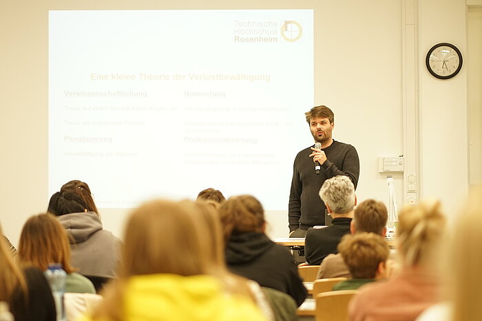 Der Vortrag „Trauer – Ein kurzer Überblick darüber, wie Menschen Verluste bewältigen“ von Prof. Dr. Tim Krüger stieß auf großes Interesse und war sehr gut besucht. Zahlreiche Studierende, Mitarbeitende und Gäste aus der Region kamen zusammen, um sich mit einem Thema auseinanderzusetzen, das im Alltag oft wenig Raum bekommt. Prof. Dr. Krüger schaffte es, wissenschaftliche Erkenntnisse verständlich darzustellen und gleichzeitig die individuellen Erfahrungen der Zuhörerinnen und Zuhörer anzusprechen. Besonders hervorgehoben wurde, dass Trauer sehr unterschiedlich verläuft und nicht in vorgegebene Phasen gezwängt werden kann – ein Impuls, der viele zum Nachdenken anregte.