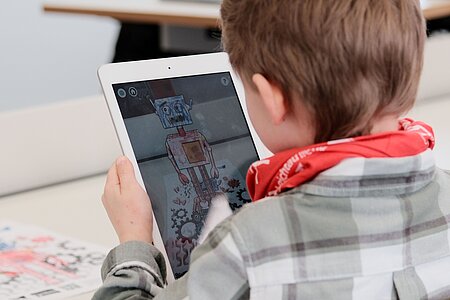 Auch die Spielestation „Peter ’o Meter“ war Teil des Programms: Die Kinder konnten auf Papier ausgemalte Roboter per App auf dem Tablet „zum Leben erwecken“. Je nachdem, welcher Emotions-Button gedrückt wurde, zeigte der Roboter die entsprechende Emotion in 3D – ein spielerischer Einstieg in frühkindliche digitale Bildung.