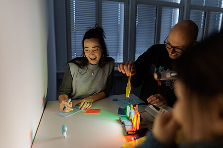 An der TH Rosenheim können Studierende in modernen SCALE-UP-Räumen lernen. Das sind speziell gestaltete Lernumgebungen, in denen aktives, teambasiertes Lernen im Zentrum steht. Anstelle von klassischen Vorlesungen schafft dieses Raum- und Lehrkonzept aktive Lernerfahrungen in Studio-Atmosphäre mit direktem Austausch und gemeinsamer Problemlösung.