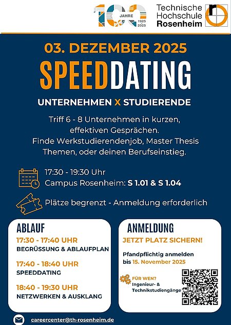 Schicke eine kurze Mail mit dem Betreff „Anmeldung Speeddating 03.12.“ an careercenter@th-rosenheim.de.