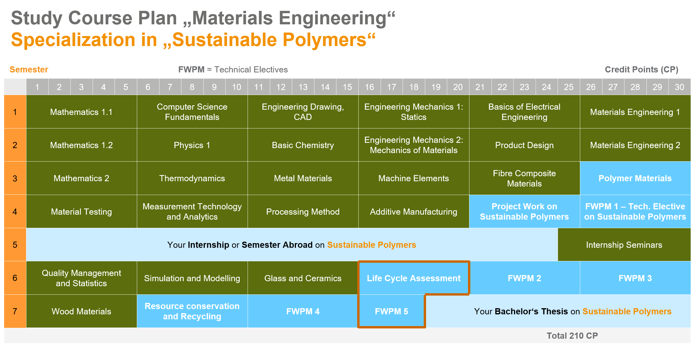 Furthermore, you have many opportunities for individual selections: In the elective modules, you can set your own focus, for example, on lightweight construction or energy technology. You can also tailor your industrial project work and your bachelor's thesis specifically to the sustainable use of plastics.