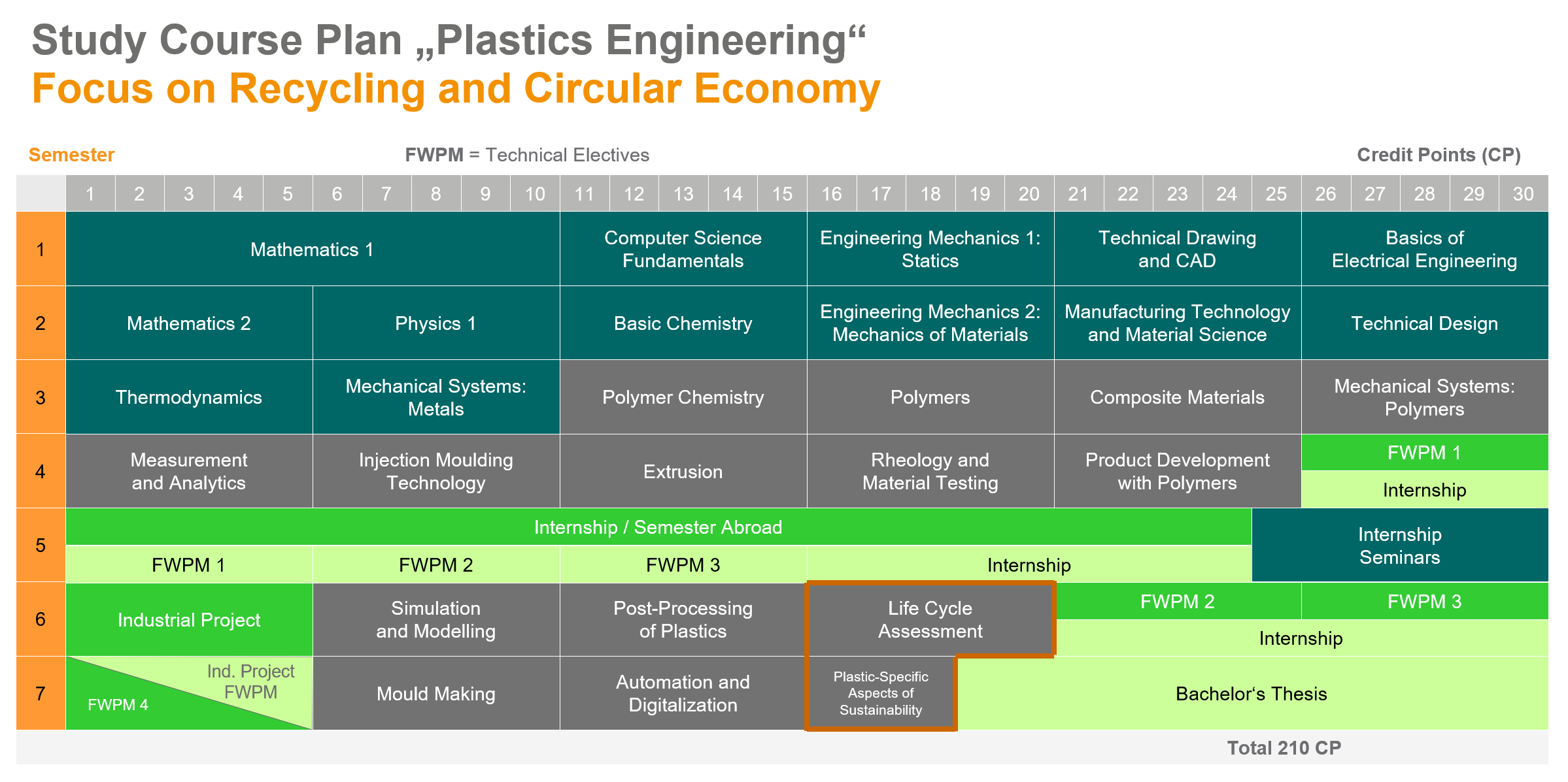 A particular focus is placed on sustainability. The modules are highlighted in light green in the study plan: topics such as recycling and the circular economy are firmly integrated into the curriculum. With modules like "life cycle assessment" and "plastic-related aspects of sustainability" - both mandatory - you will gain the necessary knowledge to design environmentally friendly plastic products, contributing to the sensible and responsible use of plastics.