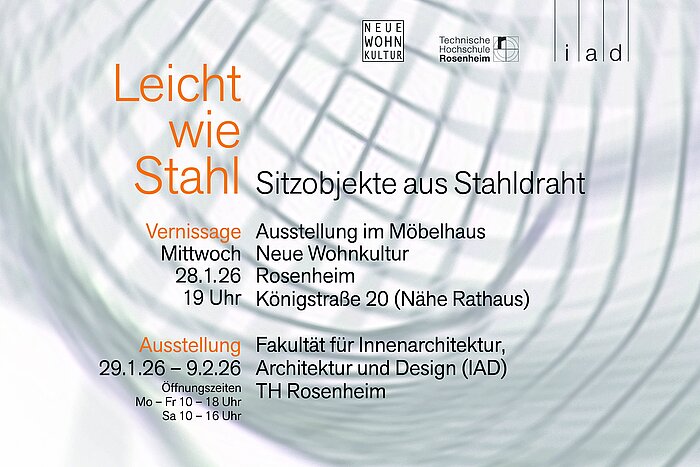 Herzlich Willkommen zur Ausstellungsvernissage »Leicht wie Stahl« ab 19 Uhr im Möbelhaus »Neue Wohnkultur« in Rosenheim. Entdecken Sie sechs Prototypen von Lounge-Chairs, die von zwölf Studierenden des Studiengangs Innenarchitektur im Fachbereich Möbeldesign nach ihren Entwürfen angefertigt wurden.