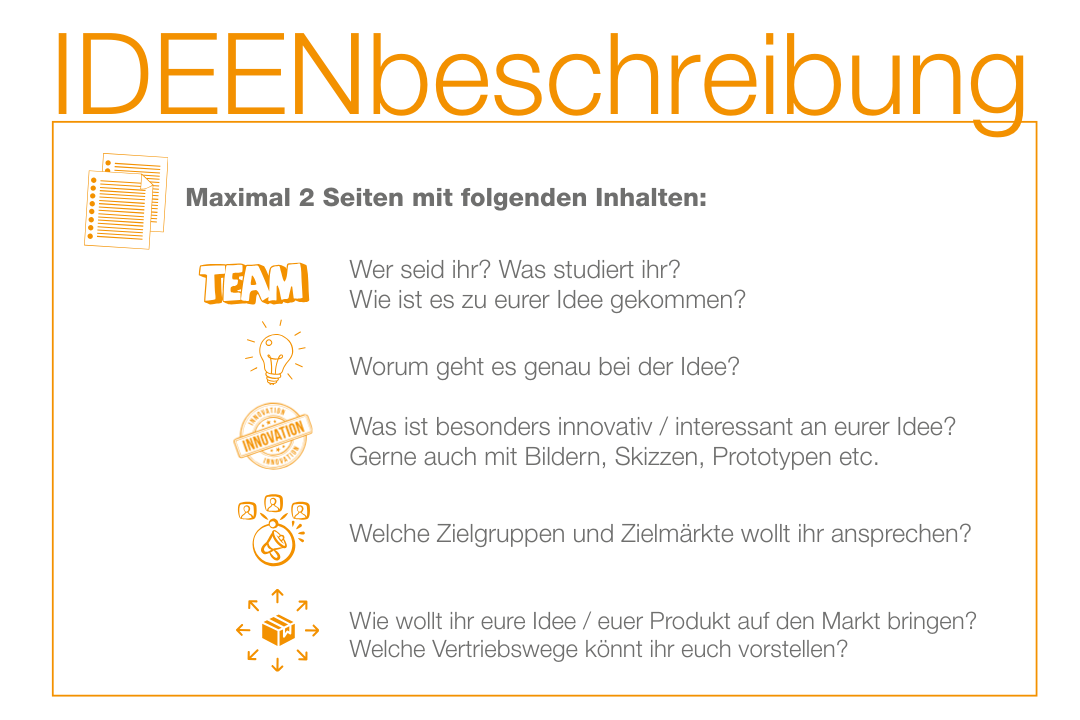 Solange es noch keine Gründung bzw. kommerzielle Verwertung der Idee gibt, sind ALLE Ideen in jedem Entwicklungsstadium willkommen!