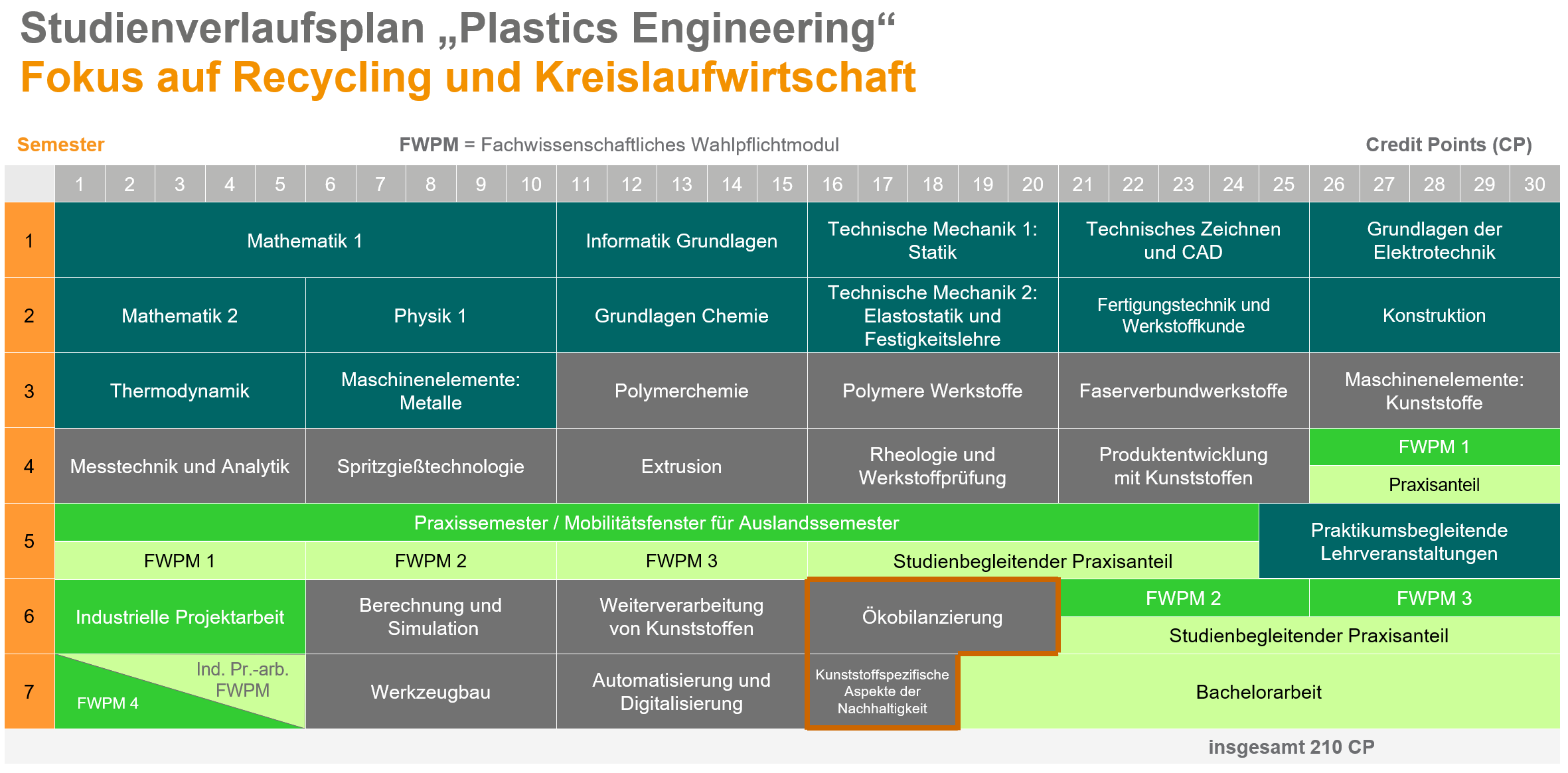 Ein besonderer Schwerpunkt liegt dann auf der Nachhaltigkeit. Die Module sind im Studienverlaufsplan grün hervorgehoben: Themen wie Recycling und Kreislaufwirtschaft sind fest im Studium verankert. Mit Modulen wie „Ökobilanzierung“ sowie „Kunststofftechnischen Aspekte der Nachhaltigkeit“ – beide als Pflichtmodule – erhältst du das nötige Wissen, um Produkte aus Kunststoffen umweltfreundlich zu gestalten, was zu einem sinnvollen und verantwortungsvollen Einsatz der Kunststoffe beiträgt.