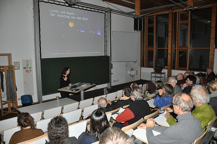 Nachdem in den vergangenen zwei Wochen Licht aus der Perspektive von Astronomie, Architektur, Dunkelheit, Gesundheit und Biologie betrachtet wurde, stand mit dem Abschlussvortrag der Veranstaltungsreihe Licht und seine Bedeutung in der Kunst im Mittelpunkt. Die Referentin Bettina Catler-Pelz, Kuratorin mit dem Schwerpunkt Licht in Kunst, Design und Architektur, stieg mit einem kunsthistorischen Rückblick in ihren Vortrag ein. Lichtkunst gibt es nicht erst, seit es elektrisches Licht gibt. Vielmehr sind Licht und Kunst untrennbar miteinander verbunden – als Beispiel nannte sie die Höhlenmalerei, die in ihrer Umsetzung an mobiles Licht gebunden war. Am Beispiel von Bruno Tauts „Glashaus“ auf der Werkbundausstellung 1914 in Köln erläuterte sie, wie im 20. Jahrhundert eine Verschiebung des künstlerischen Interesses vom statischen zum temporären und dynamischen Bild stattfand. Diese künstlerische Position, die damals noch wenig Anerkennung fand, ist heute eine der wichtigsten Strömungen in der Kunst. Grundfrage der Lichtkunst ist es, wie die visuelle Wahrnehmung überlistet werden kann. Grundlegend für alle Werke der Lichtkunst ist, dass das Kunstwerk erst durch die Kopplung von Bild und Blick entsteht, also ein ko-konstitutiver Prozess ist, der auf den vier Ebenen Lichtquelle, Raum, Zeit und dem Blick (des Betrachters) aufbaut. Damit wird die Varianz der Wahrnehmung des Betrachters zum ästhetischen Material.