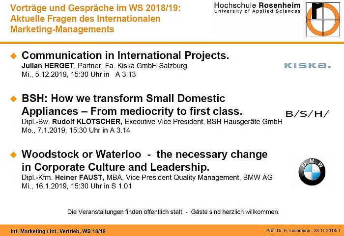 Prof. Dr. Lachmann hat dazu namhafte Manager aus der Praxis eingeladen, um ihre Sicht der Dinge und aktuelle Trends zu schildern. Eine ausführliche Diskussion mit den Studentinnen und Studenten rundet jeweils die Veranstaltung ab. Den Auftakt macht am 5. Dezember Herr Herget von der Agentur Kiska, am 7. Januar kommt Herr Klötscher von BSH Hausgeräte und schließlich am 16. Januar Herr Faust von BMW.