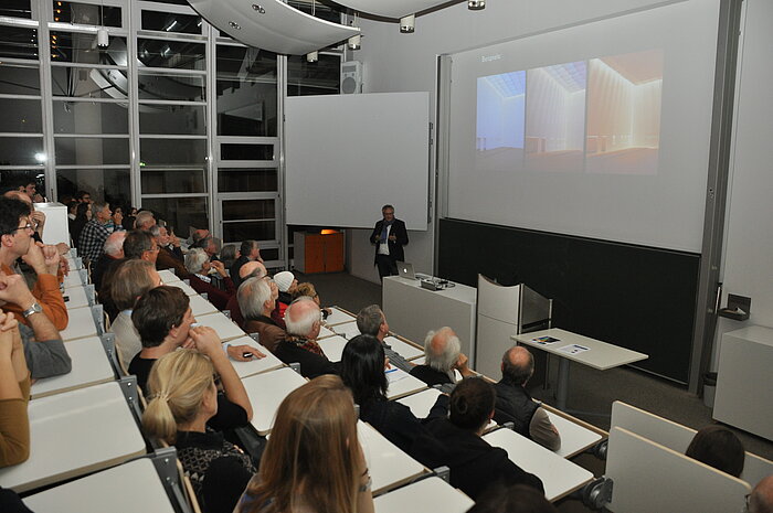 Mit dem Vortrag „Licht+Architektur – Tages- und Kunstlicht in der Architektur“ von Prof. Michael Schmidt, Architekt und Lichtplaner, setzte sich der Erfolg der Vortragsreihe „Licht+“ in der zweiten Veranstaltungswoche fort. Das Thema lockte knapp 250 Interessierte an die Hochschule Rosenheim. Dabei stand alles im Zeichen von Licht als faszinierendes Gestaltungselement. „Bereits vor der Realisierung eines Bauvorhabens zu wissen, wie sich Tageslicht in den Räumen verhält, ist elementar“, so Referent Prof. Michael Schmidt. Ein maßstabsgetreues Modell des Bauobjekts bietet hier die optimale Voraussicht, wie das Tageslicht später in den Räumen erlebt wird. Unabhängig davon, ob es sich um Kunst- oder Tageslicht handelt, ist letztendlich entscheidend, wie das Licht auf Oberflächen wirkt. Anhand von realisierten Lichtprojekten mit unterschiedlichen Problemstellungen veranschaulichte Schmidt, dass Licht ein entscheidendes Gestaltungelement bei Gebäude- oder Freianlagenkonzepten ist. Die Interaktion von Tages- und Kunstlicht z. B. mit der Umgebung, Gebäudeöffnungen und Oberflächen muss daher bei Bauprojekten in Form einer ganzheitlichen Lichtplanung bereits vorab berücksichtigt werden. Nur so kann Licht Architektur richtig in Szene setzen.