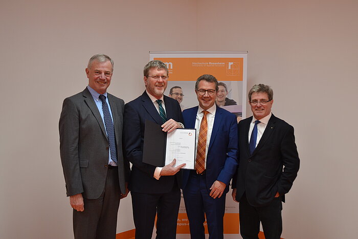 In einem feierlichen Rahmen wurde Dr. Marcel Huber nun für seine Verdienste um die Hochschule Rosenheim gewürdigt. Hochschulpräsident Prof. Heinrich Köster, Hochschulratsvorsitzender Franz Winterer und Kuratoriumsvorsitzender Klaus Stöttner, MdL überreichten Dr. Marcel Huber die Urkunde der Ehrensenatorenwürde persönlich und zeigten somit ihren außerordentlichen Dank. „Die Hochschule Rosenheim ist Dr. Marcel Huber zu großem Dank verpflichtet. Sein Engagement forciert die Weiterentwicklung der Hochschule und fokussiert die Ausbildung des Nachwuchses für die Region Südostoberbayern“, so Hochschulpräsident Prof. Heinrich Köster. Kuratoriumsvorsitzender Klaus Stöttner, MdL ergänzt: „Durch die Erweiterung der Hochschule Rosenheim nach Mühldorf und Burghausen wächst der Wirtschaftsraum der Region 18++ noch stärker zusammen. Dies unterstützt Dr. Marcel Huber grenzüberschreitend enorm und verdient daher große Anerkennung.“ Hochschulratsvorsitzender Franz Winterer fügt dem hinzu, dass „die Ernennung zum Ehrensenator eine Auszeichnung der Persönlichkeit von Dr. Marcel Huber ist, der sich jenseits von Mandat und Amt für unsere Hochschule außergewöhnlich engagiert“.