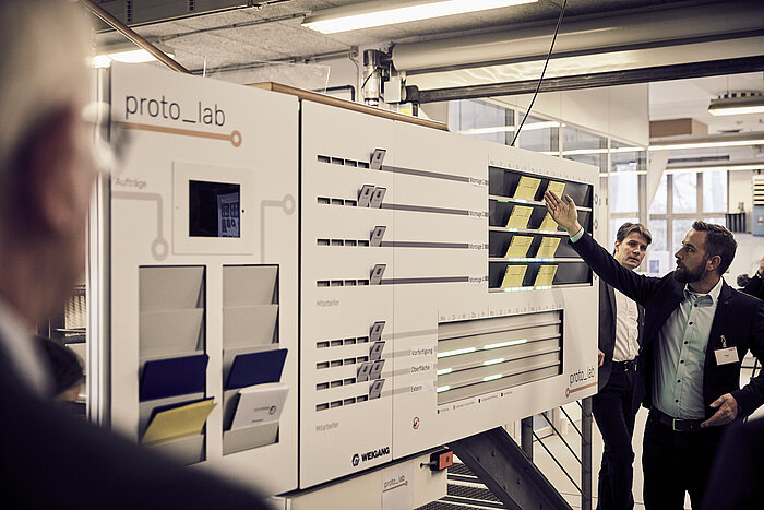 Die großen Herausforderungen der Digitalisierung und Automatisierung gemeinsam angehen und die gute Zusammenarbeit fortsetzen – bei einem Besuch der Firma Homag Group AG an der Technischen Hochschule Rosenheim waren sich alle Teilnehmer einig über dieses Ziel. Der weltgrößte Hersteller von Holzbearbeitungsmaschinen und Anlagen für die Möbelindustrie aus dem Schwarzwald ist der Technischen Hochschule eng verbunden. Bei der Präsentation der hochflexiblen und IoT-vernetzten I4.0-Produktionsumgebung im proto_lab-Labor konnte sich der Vorstand von den Ergebnissen der interdisziplinären Zusammenarbeit von Professoren, Mitarbeitern und Studierenden aus insgesamt vier Fakultäten überzeugen. Die Produktionsarchitektur der Zukunft ermöglicht durch eine flexible Modulbauweise und dezentrale Kommunikationswege zwischen allen Prozessteilnehmern (Menschen, Maschinen, Material etc.) maximale Flexibilität bei der Erfüllung individueller Kundenwünsche. Zugleich können einzelne Prozessabläufe durch den Einsatz von mobilen Robotern oder fahrerlosen Transportsystemen auch automatisiert werden. Die Lösungen aus dem proto_lab eignen sich daher für große Unternehmen ebenso wie für kleine