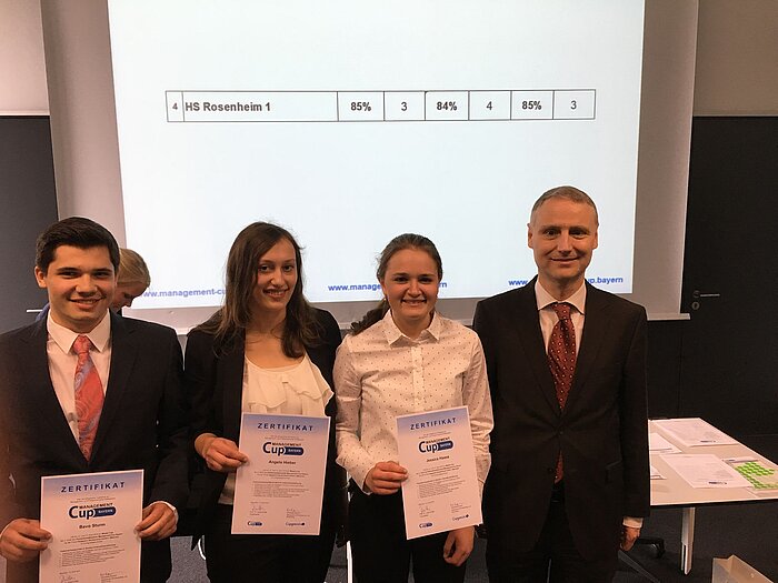 Das zweite Team, zu dem die Studierenden Ilona Borchardt (Maschinenbau), Susanne Huber und Anna Kurz (beide BWL), Alexander Bernhart (WI)) sowie Michael Gumpp (Innenarchitektur) gehörten, trat in Regensburg bei der Maschinenfabrik Reinhausen an. Das interdisziplinäre Team hatte sich vorgenommen, das qualitativ beste Produkt für den günstigsten Preis anzubieten. Also hieß es, Investitionen zu tätigen, die die Selbstkosten des Produktes auf lange Sicht reduzierten und dennoch genug Budget für die Entwicklung neuester Technologien bereithielten. Die Strategie zahlte sich am Ende aus und so holten sich die Rosenheimer knapp hinter Platz eins die Silbermedaille.