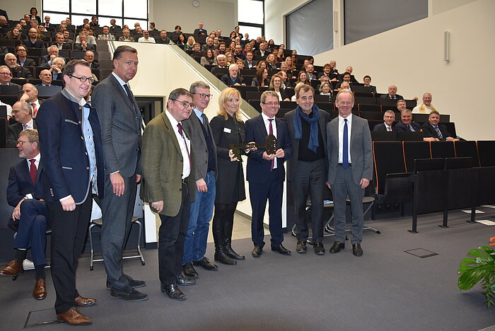 Zur symbolischen Schlüsselübergabe versammelten sich anschließend (von rechts) Anton Steinberger, Geschäftsführer der Campus Burghausen GmbH, Burghausens Bürgermeister Hans Steindl, Professor Dr. h.c. Heinrich Köster, Präsident der Technischen Hochschule Rosenheim, Professor Dr. Britta Bolzern-Konrad, Leiterin des Campus Burghausen, Dr. Bernd Sibler, Altöttings Landrat Erwin Schneider, Staatssekretär Stefan Mayer und Landtagsmitglied Dr. Martin Huber.