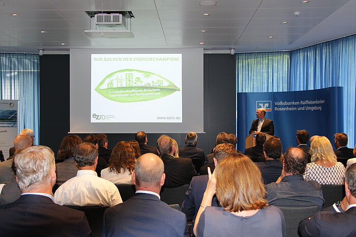 Prof. Dr. Dominikus Bücker, wissenschaftlicher Leiter der ezro, lobte in seinem Impulsvortrag die insgesamt 15 eingereichten Projekte und den damit verbundenen Beitrag der Unternehmen zum Gelingen der regionalen Energiewende. Peter Heßner von der Wirtschaftsförderung im Landratsamt Rosenheim stellte die Projekte vor.