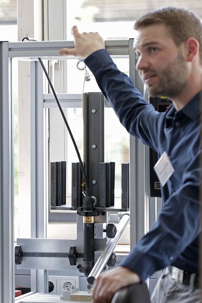 - Bildmaterial: Jochen Winning von der Deutschen Gütegemeinschaft Möbel präsentiert vor den zahlreichen Teilnehmern die Möglichkeiten, Innovationen und Qualität mit Hilfe von Branchenlabeln darzustellen; Ein Workshop- Teilnehmer testet die Virtual Reality als Möglichkeit in der Produktentwicklung; Möbelprüfung in der Anwendung – Prüfingenieur Michael Auernheimer (DIM Rosenheim) erklärt im Workshop verschiedene Prüfmethoden und Prüfmaschinen für die Möbelprüfung;