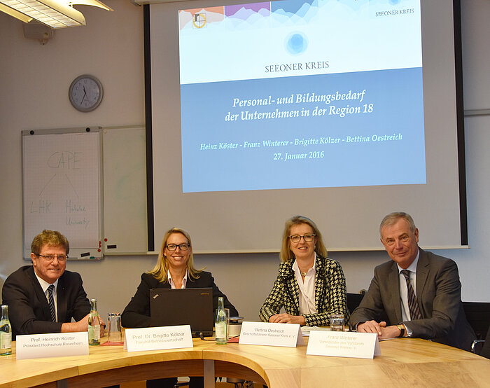 - Bildmaterial: Präsentierten die Studienergebnisse (v.l.): Prof. Heinrich Köster (Präsident Hochschule Rosenheim), Prof. Dr. Brigitte Kölzer (Fakultät Betriebswirtschaft), Bettina Oestreich (Geschäftsführerin Seeoner Kreis), Franz Winterer (Vorstandsvorsitzender Seeoner Kreis)