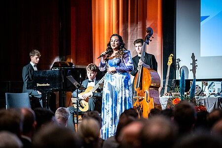 In einer Gesprächsrunde berichteten aktuelle und frühere Studierende von ihrer Zeit an der TH Rosenheim. „Ich habe hier das nötige Rüstzeug bekommen, um in den Familienbetrieb einzusteigen und schließlich die Leitung zu übernehmen“, sagte Unternehmerin Dagmar Fritz-Kramer, Chefin des Fertighausherstellers Baufritz GmbH. Die ehemaligen Studierenden Emma Graupner und Vitus Zenz hoben im Gespräch mit Moderatorin Ursula Heller die vielfältigen Möglichkeiten im Bereich Forschung hervor und erwähnten auch die Unterstützung der Hochschule bei der Gründung von Start-Ups.