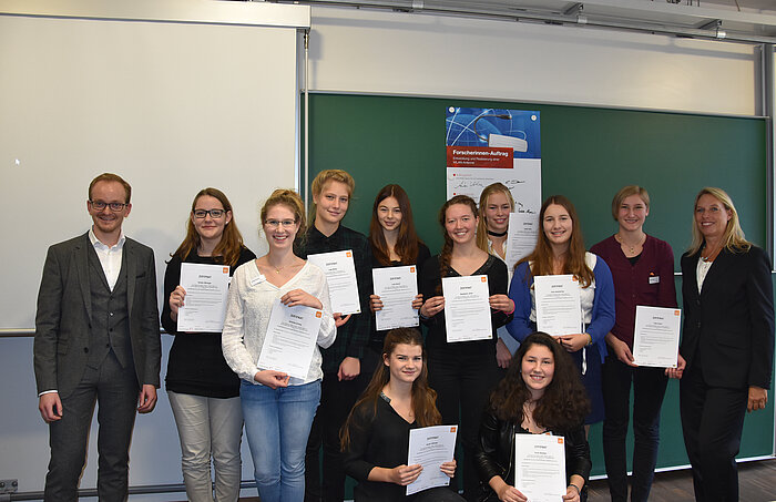 - Bildmaterial: Urkundenübergabe: die jungen Forscherinnen mit Anton Kathrein und Prof. Dr. Brigitte Kölzer; Auf der Abschlusspräsentation(v.l.n.r.): Christa Schneider (Assistentin der Frauenbeauftragten, Hochschule Rosenheim), Alfred Thunig (Leiter Personalmarketing, KATHREIN-Werke KG), Prof. Dr. Brigitte Kölzer (Frauenbeauftragte der Hochschule Rosenheim), Anton Kathrein (Geschäftsführender Gesellschafter, KATHREIN-Werke KG), Stefanie Hilligweg (Leiterin SCHULEWIRTSCHAFT Akademie, bbw), Prof. Heinrich Köster (Präsident der Hochschule Rosenheim)