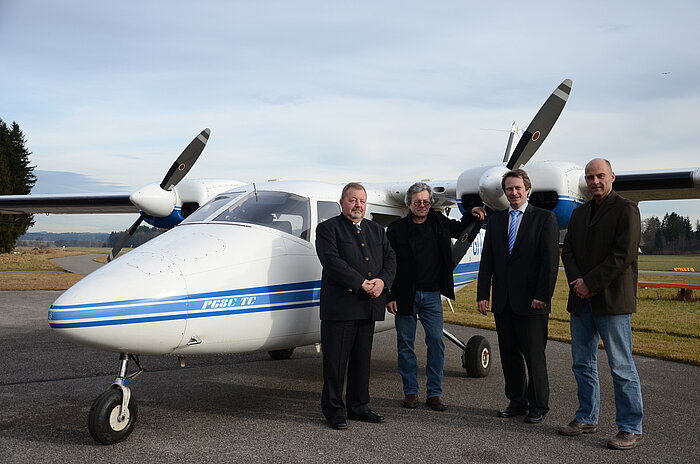 - Bildmaterial: Die Projektpartner von RO-BERTA: Vorsitzender der Hagelabwehr Rosenheim, Josef Huber, Hagelfliegerpilot Georg Vogl, Christian Bürger, Kreisdirektor Agrar der Volksbanken und Raiffeisenbanken in Stadt und Landkreis Rosenheim und Prof. Dr. Peter Zentgraf, Projektleiter RO-BERTA2 an der Hochschule Rosenheim