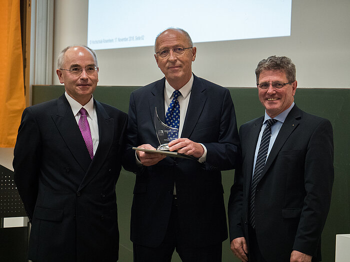 Auch in diesem Jahr zeichnete die Hochschule wieder die Besten der Besten aus und verlieh an die jeweils Jahrgangsbesten den Award of Excellence. Der Gold-Award ging an Markus Scheibengraber für seinen Bachelorabschluss von 1,08 im Studiengang Wirtschaftsmathematik-Aktuarwissenschaften. Über die Awards in den Kategorien Silber und Bronze freuten sich Florian Kollmann für seinen Bachelorabschluss der Note 1,09 in Elektro- und Informationstechnik sowie die Innenarchitekturabsolventin Verena Huber für ihren Abschluss mit der Note 1,11. Als beste Masterstudiengangsabsolventen wurden Maximilian Mangst für seinen hervorragenden Masterstudienabschluss in Elektro- und Informationstechnik und als Bester der berufs-/weiterbildenden Bachelor- und Masterabschlüsse Christoph Bauer für seinen Studienabschluss in Master of Business Administration Management and Leadership ausgezeichnet.