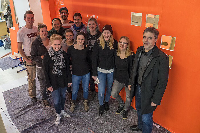 14 Studierende sind seit Oktober 2016 mit der Planung und dem Bau des Standes beschäftigt. Das Projekt geht über die klassischen Aufgaben der Innenarchitektur hinaus. So kümmern sich die Studierenden auch um Themen wie Werbung, grafische Gestaltung und Webauftritt. Betreut wird das Semesterprojekt von den Dozenten Prof. Gabriel Weber und Dipl.-Des. Fabian Rothe.