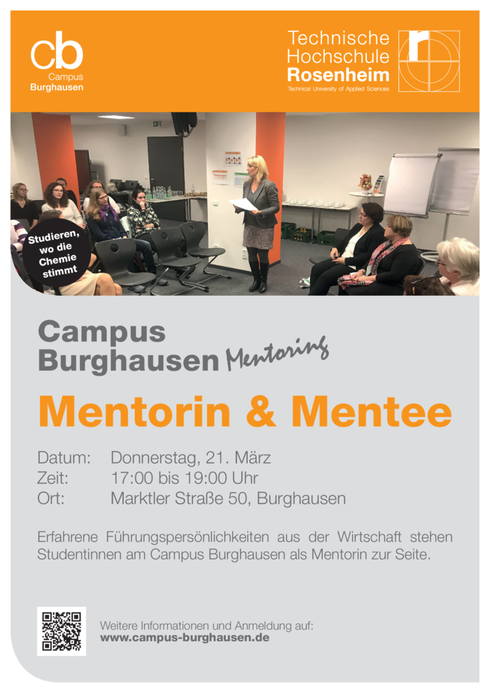 Das Mentoring-Programm im Rahmen der Technischen Hochschule Rosenheim wurde nun auch exklusiv für unsere Studentinnen des Campus Burghausen ins Leben gerufen um beim Netzwerken, im Studium oder beim Berufseinstieg zu unterstützen. Wir konnten bereits erfahrene Führungspersönlichkeiten gewinnen, die als Mentorinnen zur Seite stehen, um die Studentinnen in grundsätzlichen Fragen ihrer Ausrichtung während des Studiums und mit Blick auf ihre zukünftige Orientierung im beruflichen Umfeld zu unterstützen. Im Dezember 2018 fand bereits eine erfolgreiche Auftaktveranstaltung zum Mentoring-Programm statt. Die Follow-Up Veranstaltung mit den Matchings von Mentorin und Mentee ist für Donnerstag, 21. März 2019 von 17.00 – 19.00 Uhr geplant.