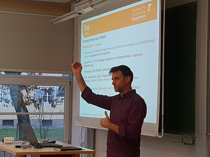 Den Teilnehmenden wurden die Rahmenbedingungen von Promotionen an Hochschulen für angewandte Wissenschaften, Finanzierungsmöglichkeiten und der aktuelle Stand der Promotionen an unserer Hochschule vorgestellt. Danach berichteten zwei Doktoranden - Herr Sigg und Herr Schöpfer - sowie eine Betreuerin, Prof. Dr.-Ing. Krommes, von ihren bisherigen Erfahrungen.