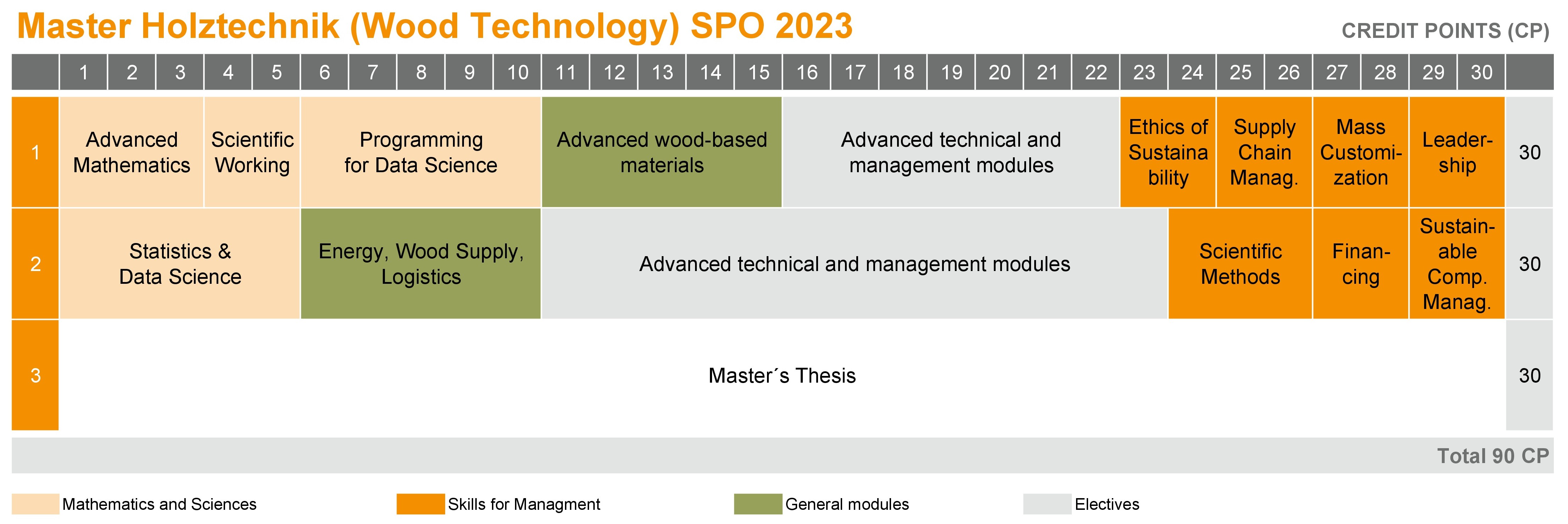 Zum anderen können die Studierenden neben einigen Pflichtmodulen aus einem vielfältigen Angebot wählen, z.B. Systems Engineering, Special Aspects of Wood Processing, Change Management, Supply Chain Management, Quality Management, Furniture Safety and Testing, sowie Innovation Management and New Product Devolopment oder Simulation.