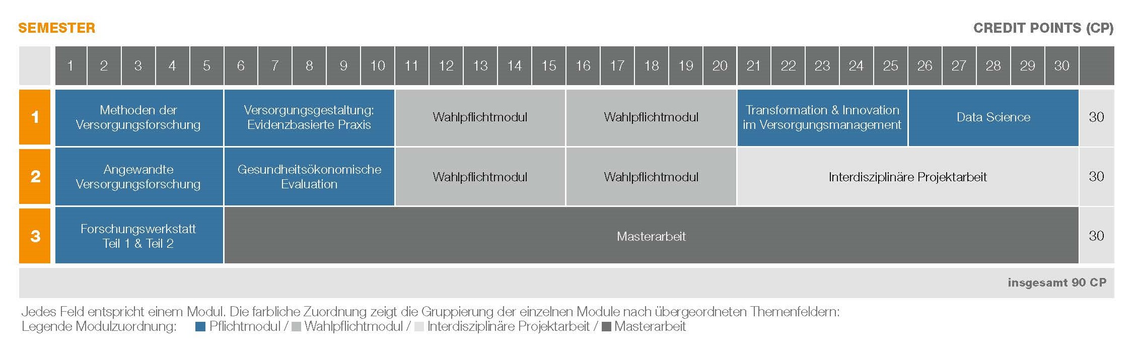 Der Studienplan umfasst Kernmodule, die Dir solide theoretische und methodische Grundlagen der Versorgungsforschung und des Versorgungsmanagements vermitteln, sowie Wahlmodule, mit denen Du Dein Profil individuell schärfst und abrundest.